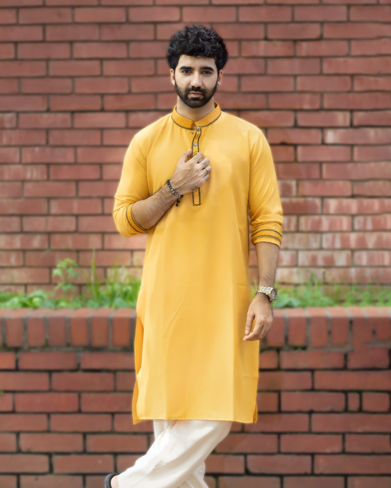 মাস্টার্ড ইয়েলো কালার মাইক্রোস্টিজ এমব্রয়ডারি লাক্সারি পাঞ্জাবি